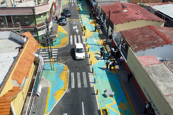 Following the success of the pilot the city received further technical assistance from GDCI to replicate the project at another location in 10 de Mayo, a low-income neighbourhood on the outskirts of León. The interventions included almost 800m of streets around schools – nearly ten times larger than the pilot – where almost half of road users are cyclists and 40% of motorised vehicles exceeded 30km/h speeds. The project redesigned nine intersections using pavement art, installing 70 bollards, chicanes, sidewalk extensions, speed bumps, signage, and planting trees. More than 1,200 children from two elementary schools and a community centre are impacted by the project, with a notable 33% reduction in pedestrians walking on the road, and a 75% reduction in vehicles exceeding 30km/h speeds. A survey of over 100 local community members showed that 93% feel the streets are safer and more accessible to children.