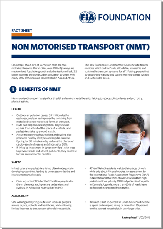 The FIA Foundation factsheets are intended to give a brief overview of the key issues in specific areas of sustainable mobility. This factsheet covers Non-Motorised Transport.